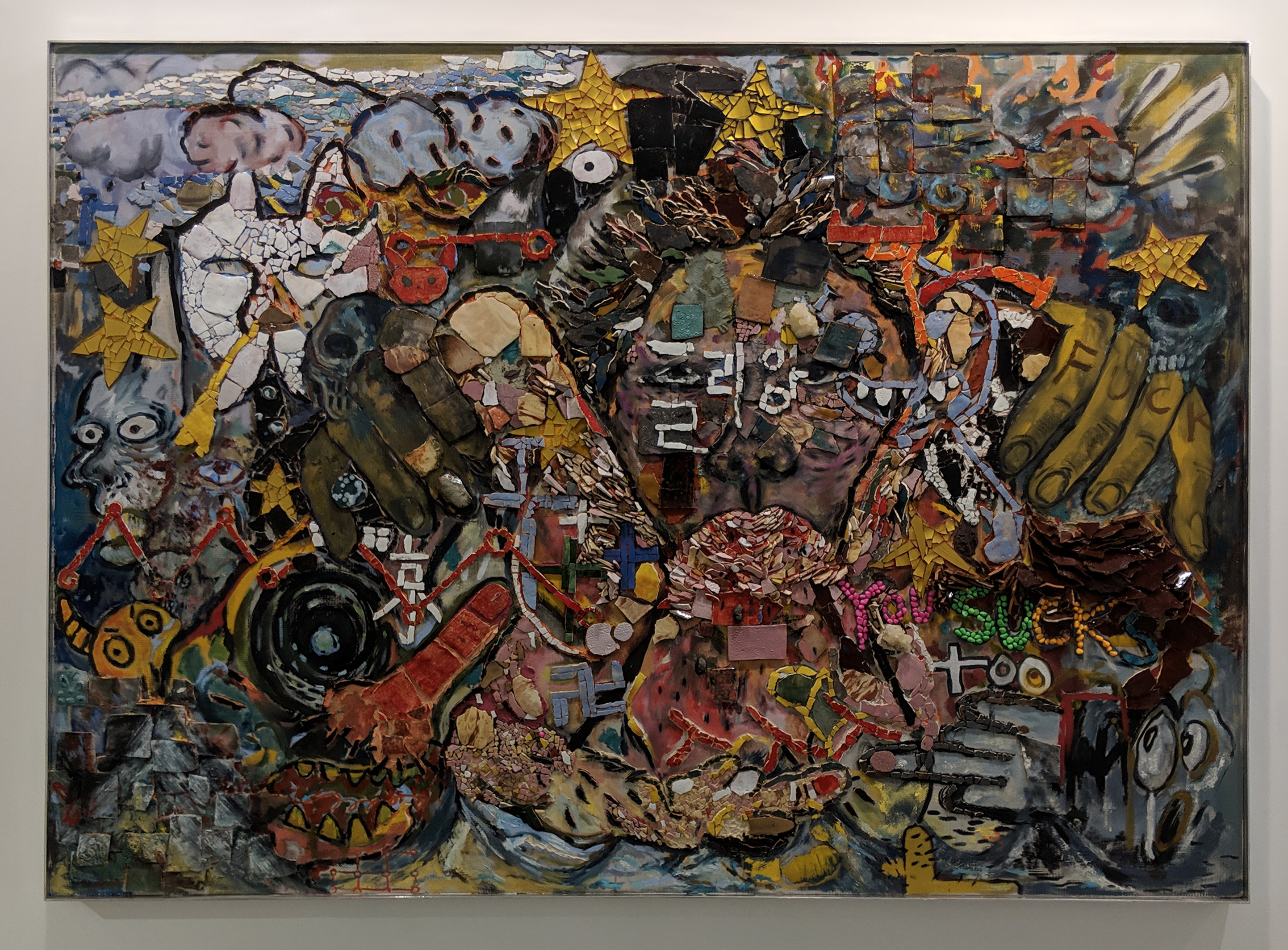 Gyon has used fire as both a motif and a tool, linking a symbolic burning with the real-world process. Gyon’s use of the imagery of fire helps to construct a unified visual language where elements of one work inform the next. She does likewise with the leitmotif of hands that appear in several works. As fire spreads to everything around it, so does the motif dart from work to work within the show. In Flame (2010), a fire-faced demon set against a patterned green canvas shoots rainbows from its malformed body. It sits above three white-hot fires burning an assortment of portraits – a group of smiling Mickey Mice burn below the image of a man dressed as a school-girl. The blue flames of the demon’s face surround a multi-colored body of flicked-flames around the demon’s maw. In situ, the demon’s eyes look directly across the room at the epic We Were Ugly (2017), a massive 24-meter panel of oil paint, wood, styro-foam and fabric, all haphazardly burnt. The charred burnt plastic can almost be smelt against its foam backing. At various points in the painting, scenes emerge like a narrative in a frieze – a skull and crossbones, disembodied eyes, a ribcage. The fire permeates both real and unreal, like a dream that has broken into the physical world.