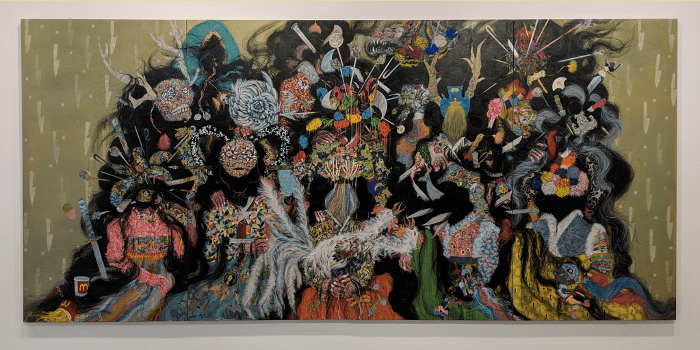 To write about Gyon’s paintings, or to view them through photographs does them a disservice. Words normalize the works, and photographs contain them, making digestible. In reality, the works are overwhelming. They force the viewer to retreat, examining tiny patches of territory, avoiding the vast theatre of the frame. The facade of Gyon’s paintings are constructed using details that make a whole. In this way, her paintings act like sub-conscious systems where, as noted by Fritjof Copra, ‘…the properties of the part can be understood only as a dynamic of the whole’ (Capra, Fritjof, “The role of physics in the current change of paradigms.” The world view of contemporary physics: Does it need a new metaphysics, 1988,p. 147). That is, that the parts only make sense when compared against their whole. Like Copra’s description of living systems, Gyon’s paintings are in flux, at least in the mind of the viewer. Like dreams, the whole is constructed through collections of fragmented details, changing depending on which details occur to the viewer. The vibrancy of the large format paintings, the thicket of references, denies a gestalt on which to grasp. And so they must be pieced together through cobbled visual fragments, piecemeal ideas. The approach to apply when trying to absorb them is experiential, not semantic. The works are less objects than experiences.