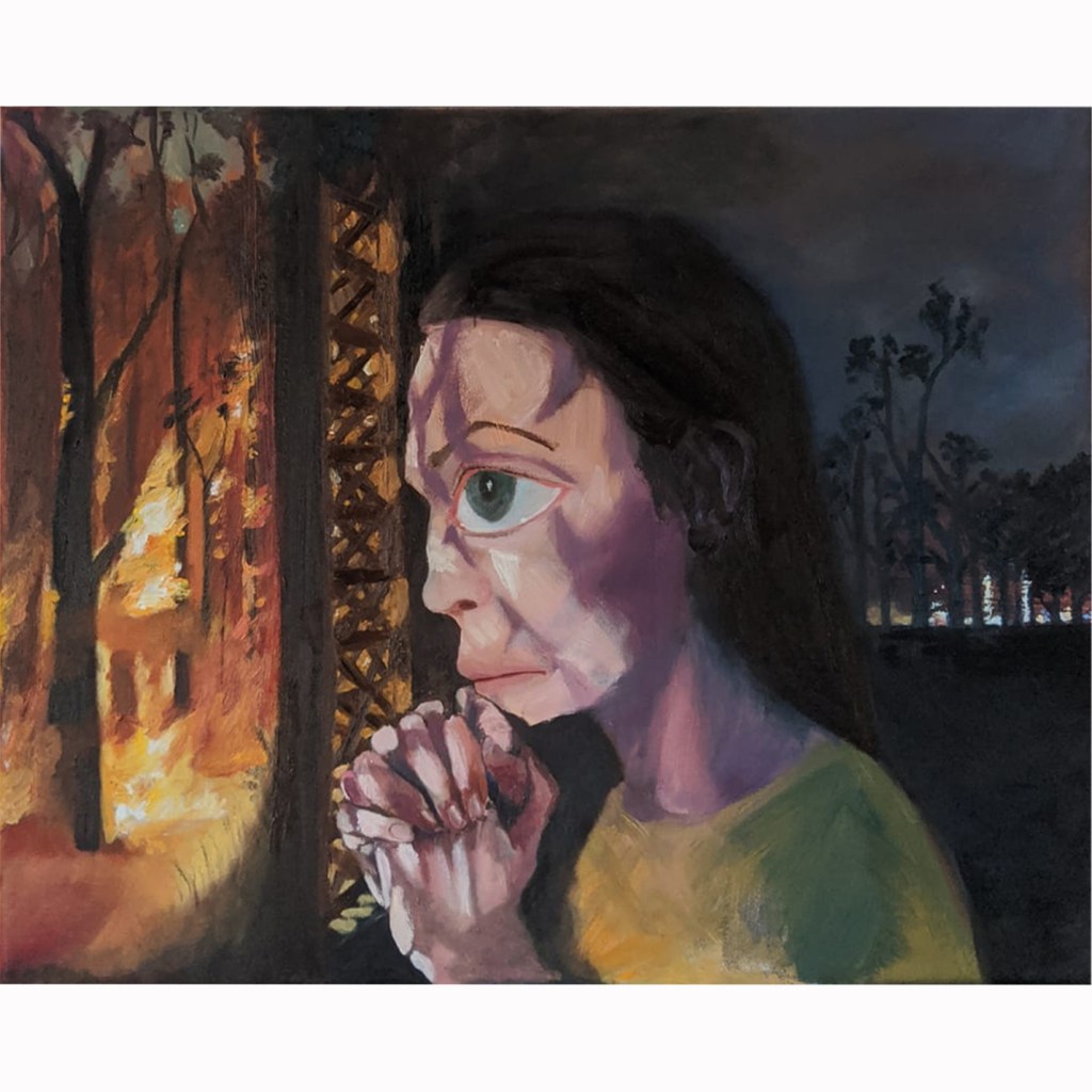 It is also not the only work that nods towards the impending cataclysm. Confession (2020), explores Julia’s relationship to the environmental world, a world she sees as under thread. As the eye scans the painting left to right, fires blaze into the night, a woman with a giant eye kneels in front of a latticed window and city lights twinkle behind a silhouetted row of trees. The woman kneels, wringing her hands, lips pursed in consternation. Her pose against the latticed screen paints her as a woman confessing her sins. The latticed screen draws from the Catholic confessional booth. In the mechanics of Catholic confession, forgiveness is granted by God after a catalogue of one’s sins, regardless of whether the confessor’s wrongs have been righted or their behaviour adjusted. Speaking with Julia about this piece, she talks about how it relates to our engagement as a species with ongoing environmental disaster. As she sees it, we forgive ourselves our roles in systems of climate change through our adoption of minor intervention, like banning plastic straws and wet wipes. We do this without deep acknowledgement of the roles we play in these networks of production and labour. Revealed through our period of Covid-19 quarantine is a worrisome truth. Even with decimated air-travel, reduced consumption and minimised living, our global carbon footprint is still too large to avoid dangerous levels of global warming. It is not a lifestyle change that must occur, but a structural change in production. But how can this happen? We are rendered complicit observers unable to effectively intervene and unable even to remove ourselves in a practical sense. Like the central woman, with eyes that are engorged on disaster, hands clasped, we wait for a miracle, or maybe forgiveness.