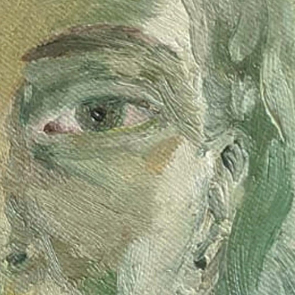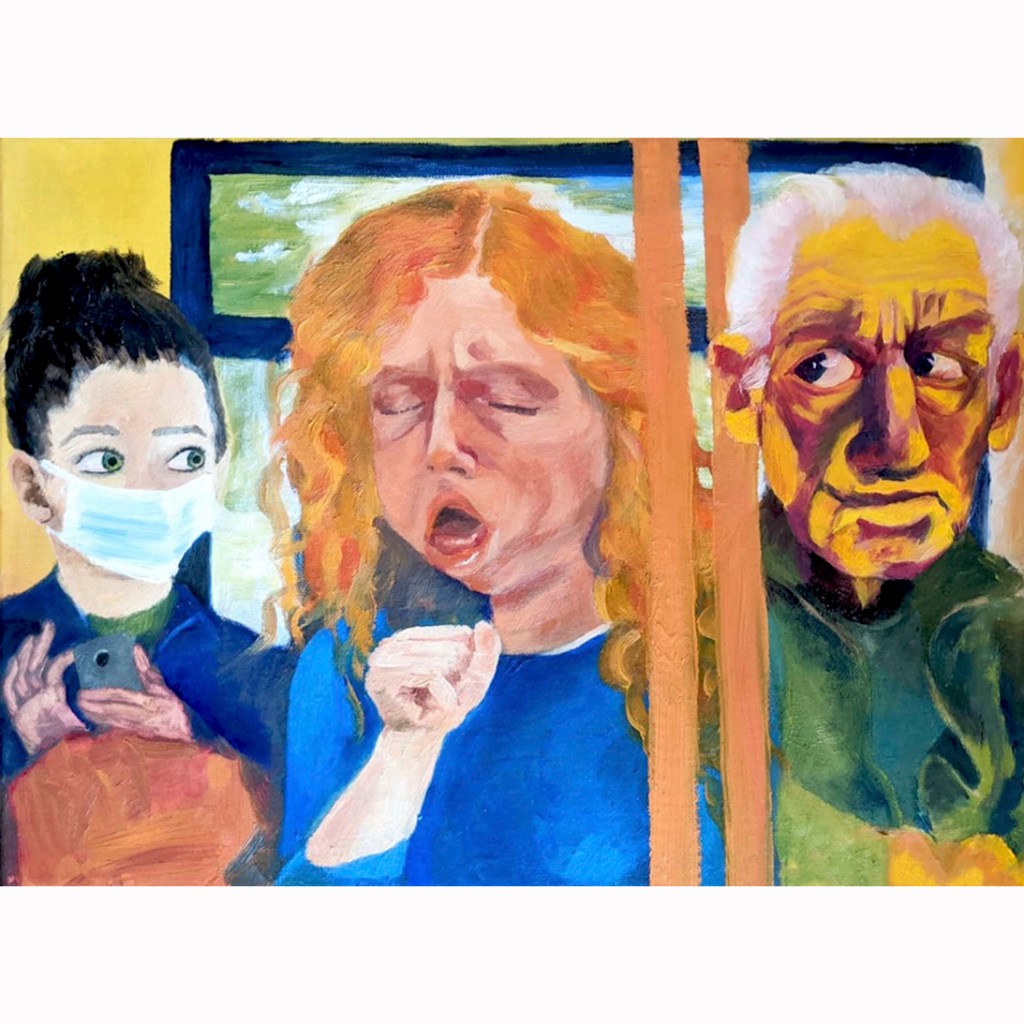The combination of different levels of public systems coalesce neatly in Overground (2020). In the painting, a central figure seated on a carriage on London’s Overground Rail System coughs violently into her fist. A large-eyed woman with a face-mask looks from behind her phone screen, seemingly mid-scroll. A nervous older man sits on the right, his skin the complexion of a deep healing bruise. The mid-cough central woman, with her puffed cheeks and curly hair, is an inversion of Botticelli’s Zephyr, God of the West Wind, who blows gently from West to East. Our figure, instead, carries an east-blowing plague, bringing with it heightened international tensions and a disquieting creeping institutionally racist rhetoric – ‘The Chinese Virus’ among the most insidious. The concerned faces in the painting seem to expect what we have come to know, the coming wind heralds a new dawn: amalgamated days, locked-in lockdown with Zoom busts on LCD displays and glitched faces from low angles.